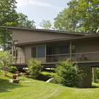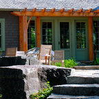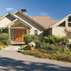 Designed as a series of barns for an extended family, this home has spectacular views from all sides. It is organic, built into the landscape, and is contemporary in style, but warmed by the use of color, stone, and antique wood flooring. The interior is an open space, which serves as a backdrop for the client's wonderful collection of art and objects.