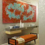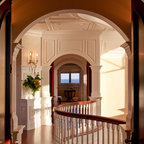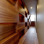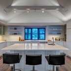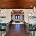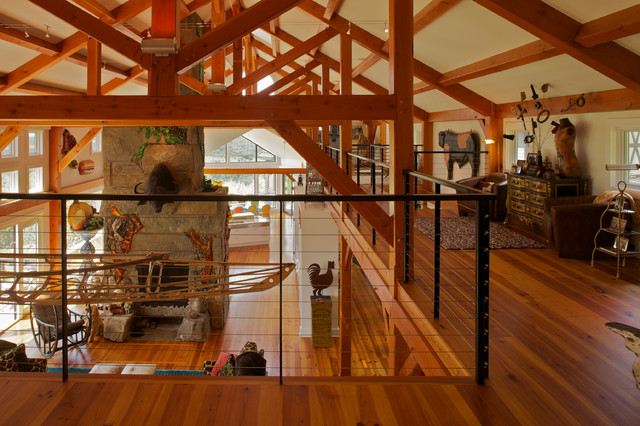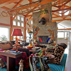 Designed as a series of barns for an extended family, this home has spectacular views from all sides. It is organic, built into the landscape, and is contemporary in style, but warmed by the use of color, stone, and antique wood flooring. The interior is an open space, which serves as a backdrop for the client's wonderful collection of art and objects.