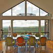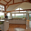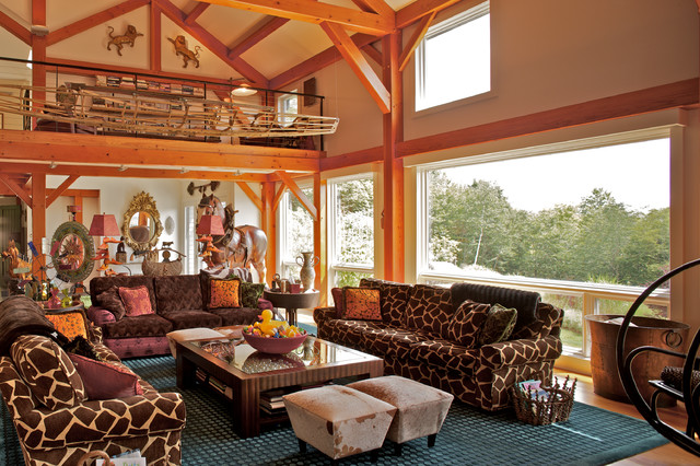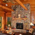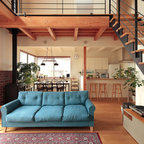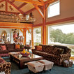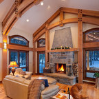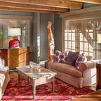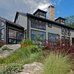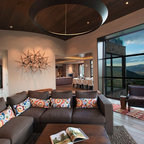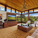 Designed as a series of barns for an extended family, this home has spectacular views from all sides. It is organic, built into the landscape, and is contemporary in style, but warmed by the use of color, stone, and antique wood flooring. The interior is an open space, which serves as a backdrop for the client's wonderful collection of art and objects.