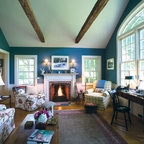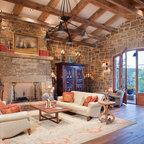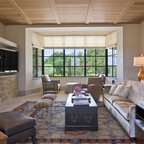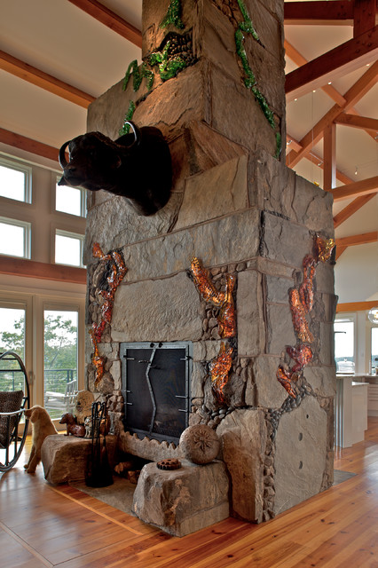 Designed as a series of barns for an extended family, this home has spectacular views from all sides. It is organic, built into the landscape, and is contemporary in style, but warmed by the use of color, stone, and antique wood flooring. The interior is an open space, which serves as a backdrop for the client's wonderful collection of art and objects.