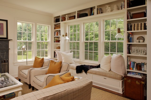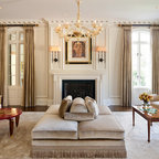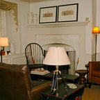 Foto de salón para visitas cerrado, campestre, grande, sin televisor, con paredes blancas, suelo de madera oscura y chimenea tradicional — Houzz