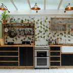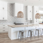 Imagen de cocina en U, escandinava, de tamaño medio, abierta, sin isla, con fregadero encastrado, armarios estilo shaker, puertas de armario blancas, encimera de madera, salpicadero blanco, salpicadero de azulejos tipo metro, electrodomésticos con paneles y suelo de madera clara — Houzz