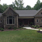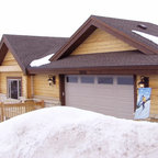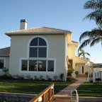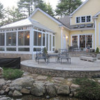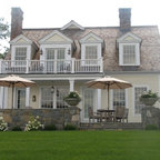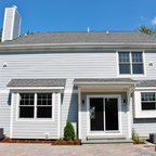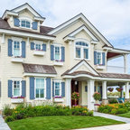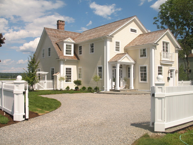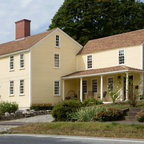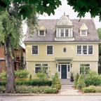 Foto de fachada de casa amarilla, tradicional, grande, de dos plantas, con revestimiento de madera, tejado a dos aguas y tejado de teja de madera — Houzz