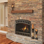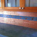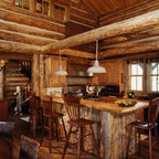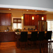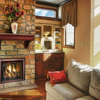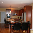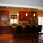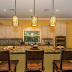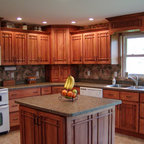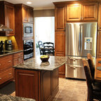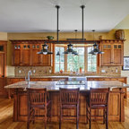 Modelo de cocina comedor en L, de estilo americano, de tamaño medio, con fregadero bajoencimera, armarios estilo shaker, puertas de armario de madera en tonos medios, encimera de granito, salpicadero multicolor, salpicadero de losas de piedra, electrodomésticos de acero inoxidable, suelo de madera clara, una isla y suelo marrón — Houzz