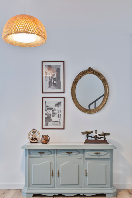 Algunas de las antigüedades ya estaban en esta casa familiar. En algunos casos, las piezas se restauraron y en otros, como esta consola de la entrada, se pintaron con Chalk paint en un tono gris azulado. La balanza y el espejo también son de época.Decoración para principiantes: 8 maneras de restaurar muebles antiguos