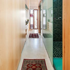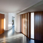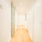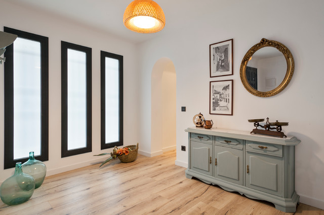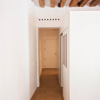Modelo de recibidores y pasillos actuales, de tamaño medio, con paredes blancas y suelo de madera clara — Houzz