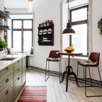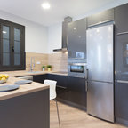 El resto del mobiliario de cocina respira aire nórdico. Está realizado especialmente para este proyecto con una formica Egger de alta calidad que imita la madera natural y sumamente resistente.Otro elemento pensado en la practicidad de esta estancia es el suelo en microcemento.Lámparas de techo Ranarp de Ikea. Los focos empotrados son el modelo Ring Thinner Frame de Lamp con bombilla led para un bajo consumo.