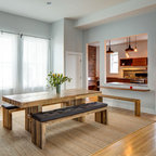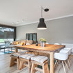 5. Sustituye las sillas de uno de los laterales de la mesa por un banco corridoConviértelo en un asiento más confortable añadiendo cojines y mantas. Además, si quieres ganar en capacidad de almacenaje, diseña un banco a medida con el sobre abatible, para poder guardar objetos en su interior.