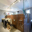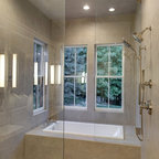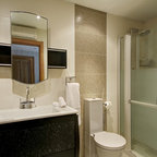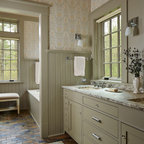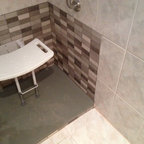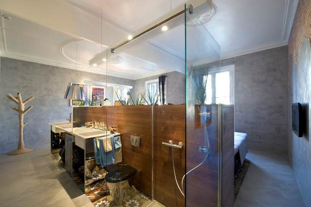 Foto de cuarto de baño con ducha, clásico renovado, pequeño, con paredes grises, suelo gris, baldosas y/o azulejos de cemento y suelo de cemento — Houzz