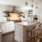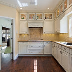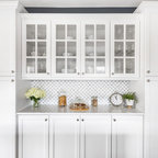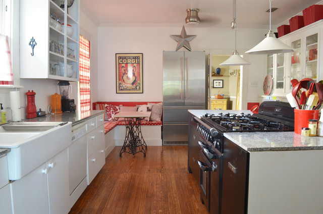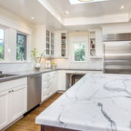 Imagen de cocina comedor clásica con fregadero sobremueble, armarios con paneles lisos, puertas de armario blancas y electrodomésticos de acero inoxidable — Houzz
