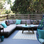 Stenciling for an outdoor porch. Define the space as a "rug", or carry the design wall-to-wall on the porch. Super memorable look!