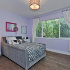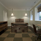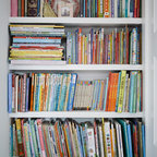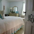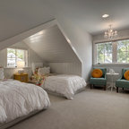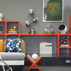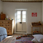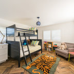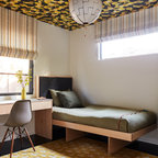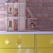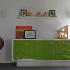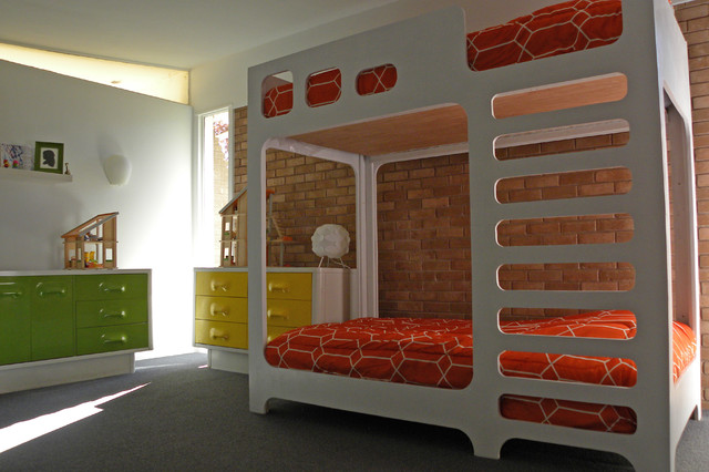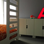 Like: red stripes on the bed blanket, funny looking ladder, yellow drawers, poofy ball light on the dresser, the holes on the top bed