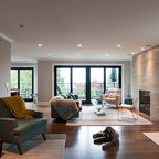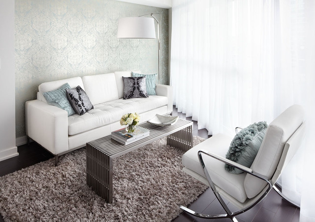 Another look- an intimate seating area with white couch and extending floor lamp.