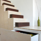 Jordan Parnass Digital Architecture 4. In-stair storage If the compact apartment has stairs (perhaps to an elevated bed or loft), then transforming the steps into drawers is another great way to boost storage space and conceal clutter.