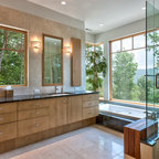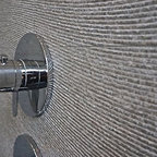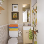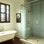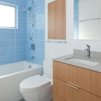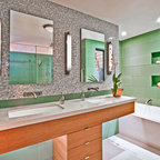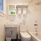 La combinación de espejos y cristal en el baño de este apartamento agranda visualmente un espacio de poco más de dos metros cuadrados. El inodoro y el mueble del lavabo hecho a medida de la serie Stark 3 de Duravit flotan por encima de los azulejos en forma de panal de abeja, y logran que el espacio quede abierto. Consejo: La continuidad del diseño le da unidad a este espacio pequeño. La grifería de pared, el lavabo de Duravit y los herrajes de la ducha son una buena muestra del lenguaje de diseño contemporáneo utilizado por el arquitecto Jordan Parnass.