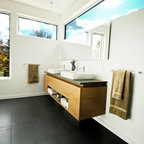 Escoge un mueble volado. Si te decides por un lavabo montado en la pared, sin zócalo, no sólo lograrás que el baño parezca más grande, sino que además te dejará algo de sitio para almacenar debajo objetos que no sean demasiado grandes. Además, se facilita la tarea de limpieza integral del suelo de la estancia.