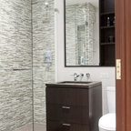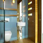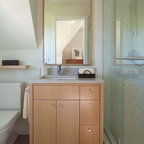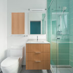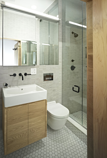 Foto de cuarto de baño actual con lavabo suspendido, armarios con paneles lisos, ducha empotrada, sanitario de pared, baldosas y/o azulejos grises y puertas de armario de madera clara — Houzz