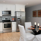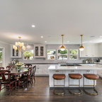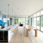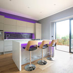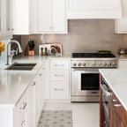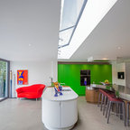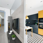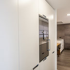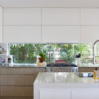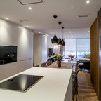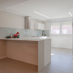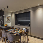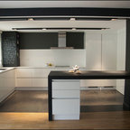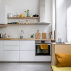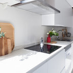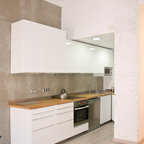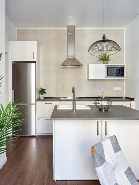 Ejemplo de cocina contemporánea, de tamaño medio, abierta, con armarios con paneles lisos, puertas de armario blancas, encimera de cemento, una isla y encimeras grises — Houzz