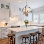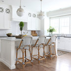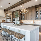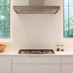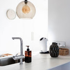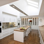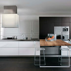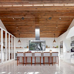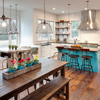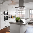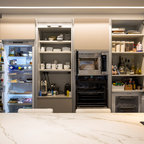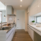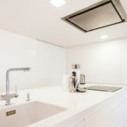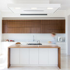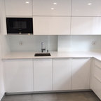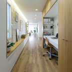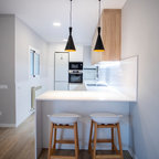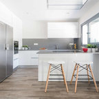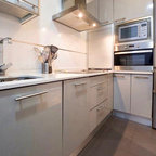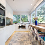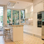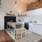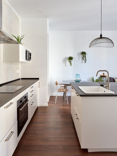 Modelo de cocina de galera, contemporánea, de tamaño medio, abierta, con armarios con paneles lisos, puertas de armario blancas, encimera de cemento, una isla, encimeras grises, fregadero encastrado, salpicadero verde, salpicadero de azulejos de cemento, electrodomésticos negros, suelo de madera oscura y suelo marrón — Houzz