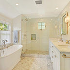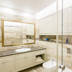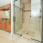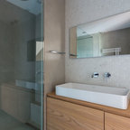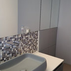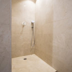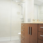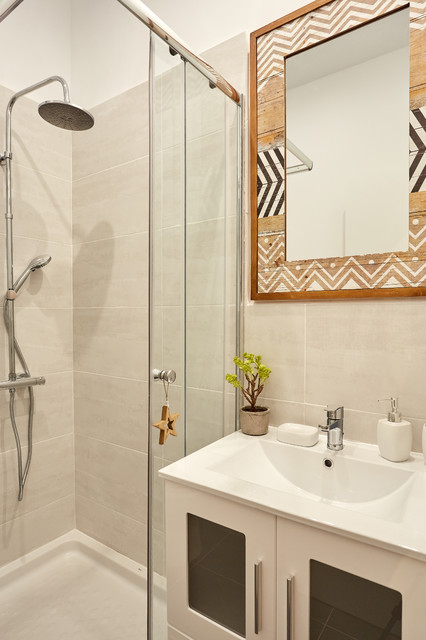 Foto de cuarto de baño con ducha, actual, pequeño, con baldosas y/o azulejos grises y baldosas y/o azulejos de cerámica — Houzz