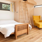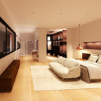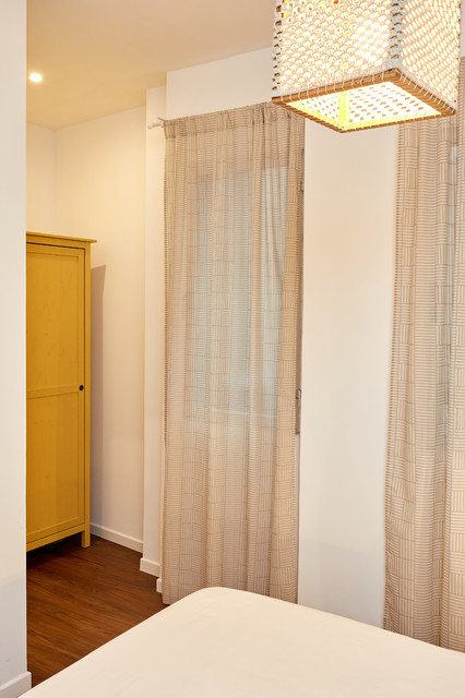 Modelo de habitación de invitados contemporánea, pequeña, con paredes verdes y suelo de madera oscura — Houzz