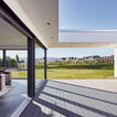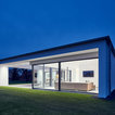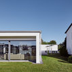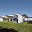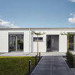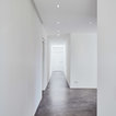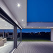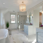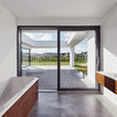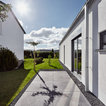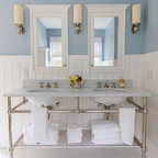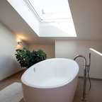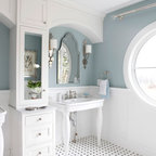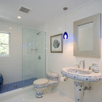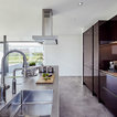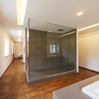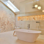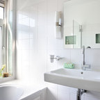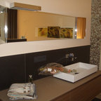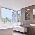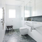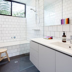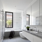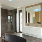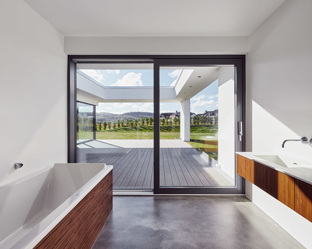 Foto de cuarto de baño moderno, de tamaño medio, con armarios con paneles lisos, puertas de armario de madera en tonos medios, paredes blancas, suelo de cemento y lavabo integrado — Houzz