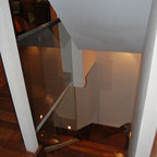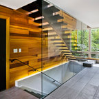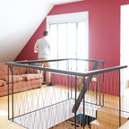 Modelo de escalera curva, contemporánea, con escalones de madera, contrahuellas de madera y barandilla de cable — Houzz
