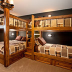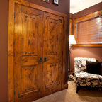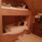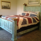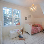 Modelo de dormitorio rústico con paredes blancas y suelo de madera en tonos medios — Houzz
