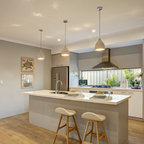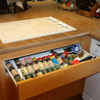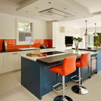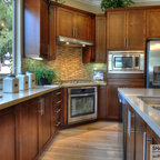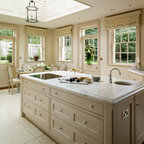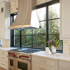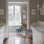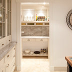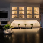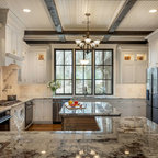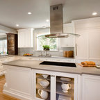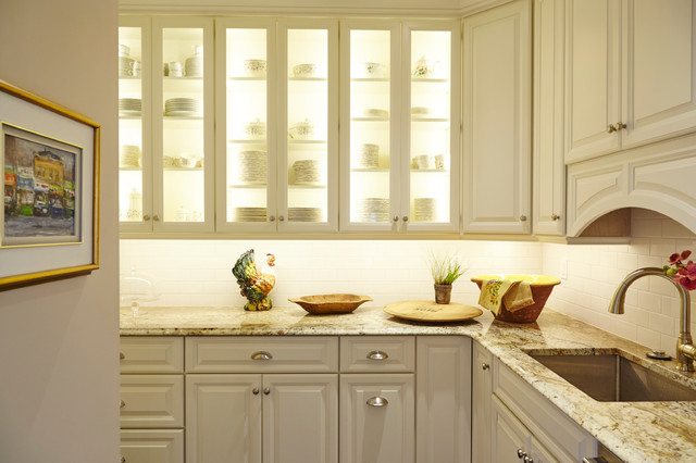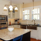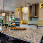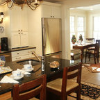 Diseño de cocina comedor en U, clásica, grande, con fregadero bajoencimera, armarios con paneles con relieve, puertas de armario blancas, encimera de granito, salpicadero blanco, salpicadero de azulejos tipo metro, electrodomésticos de acero inoxidable, suelo de madera oscura, suelo marrón y una isla — Houzz