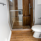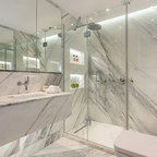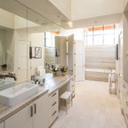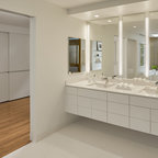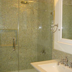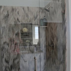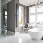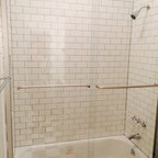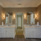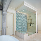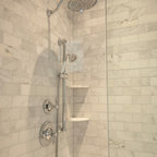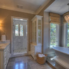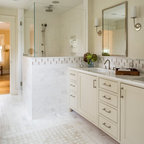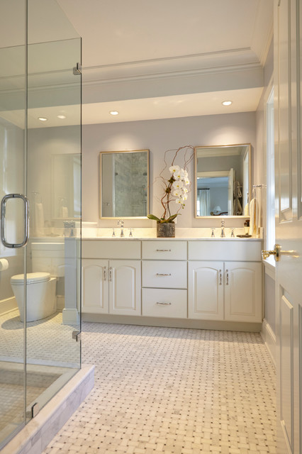 Modelo de cuarto de baño principal, tradicional, grande, con armarios con paneles con relieve, puertas de armario blancas, ducha esquinera, sanitario de dos piezas, paredes blancas, suelo con mosaicos de baldosas, lavabo bajoencimera, suelo blanco y ducha con puerta con bisagras — Houzz