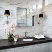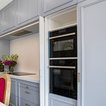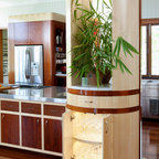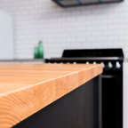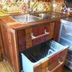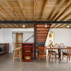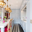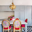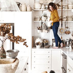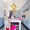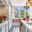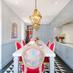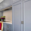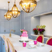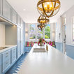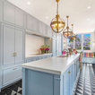 Foto de cocina de galera, bohemia, de tamaño medio, cerrada, con fregadero de doble seno, armarios con rebordes decorativos, puertas de armario azules, encimera de cuarzo compacto, salpicadero blanco, suelo de baldosas de cerámica, una isla y encimeras blancas — Houzz