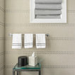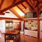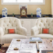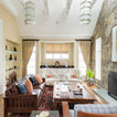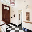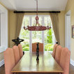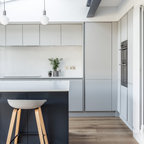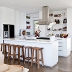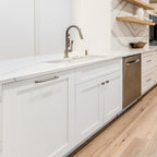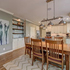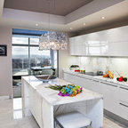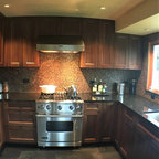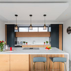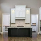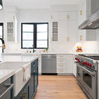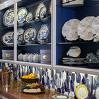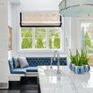 Clean, crisp kitchen, transitional with just enough of a contemporary feeling set off with blue and white fabrics on the banquette and window treatments. The blackmarble geometric floor grounds the design.