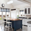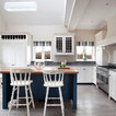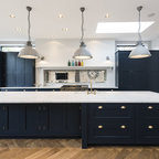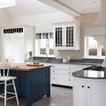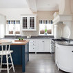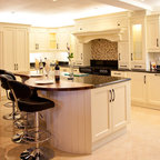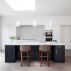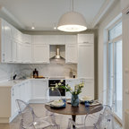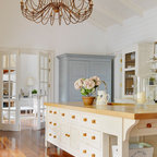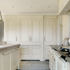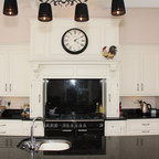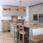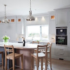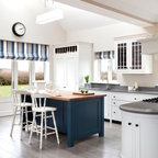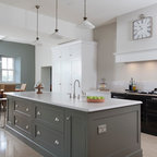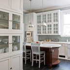 Foto de cocina en L, clásica, con armarios estilo shaker, puertas de armario blancas, salpicadero verde, electrodomésticos de acero inoxidable y una isla — Houzz