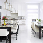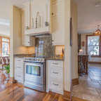 Foto de cocina comedor en U, de estilo de casa de campo, grande, con puertas de armario blancas, electrodomésticos de acero inoxidable, una isla, fregadero sobremueble, armarios con paneles empotrados, encimera de mármol, salpicadero blanco, salpicadero de losas de piedra, suelo de madera en tonos medios y suelo marrón — Houzz
