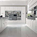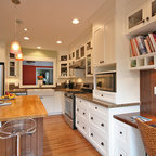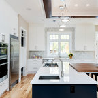 Diseño de cocina comedor en U, de estilo de casa de campo, grande, con fregadero sobremueble, armarios con paneles empotrados, puertas de armario blancas, encimera de mármol, salpicadero blanco, salpicadero de losas de piedra, electrodomésticos de acero inoxidable, suelo de madera en tonos medios y una isla — Houzz
