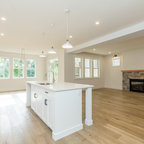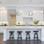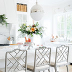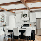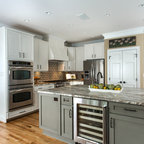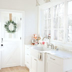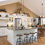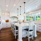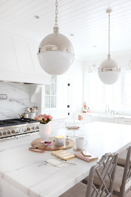 Imagen de cocina comedor en U, campestre, grande, con puertas de armario blancas, electrodomésticos de acero inoxidable, una isla, fregadero sobremueble, armarios con paneles empotrados, encimera de mármol, salpicadero blanco, salpicadero de losas de piedra y suelo de madera en tonos medios — Houzz