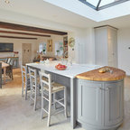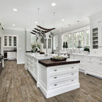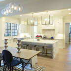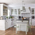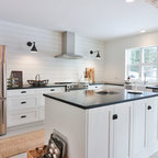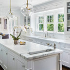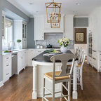 Ejemplo de cocina comedor en U, campestre, grande, con puertas de armario blancas, electrodomésticos de acero inoxidable, una isla, fregadero sobremueble, armarios con paneles empotrados, encimera de mármol, salpicadero blanco, salpicadero de losas de piedra, suelo de madera en tonos medios y suelo marrón — Houzz