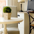 Gray chair with pattern, marble backsplash, white cabinet, basket (pop of color)
