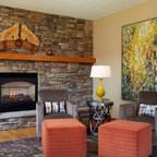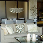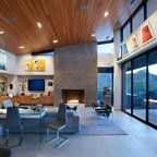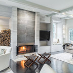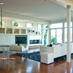 Imagen de salón para visitas abierto, contemporáneo, con paredes blancas, chimenea lineal y televisor colgado en la pared — Houzz