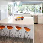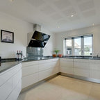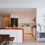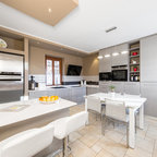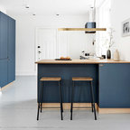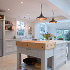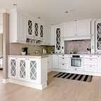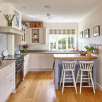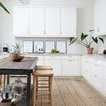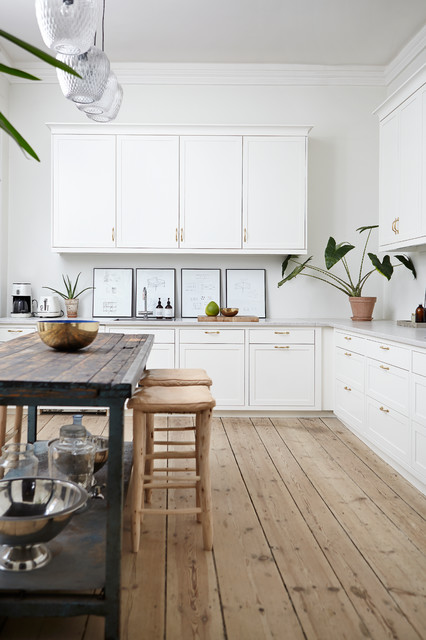 Modelo de cocina comedor en L, nórdica, grande, con una isla, armarios estilo shaker y puertas de armario blancas — Houzz