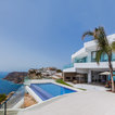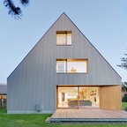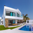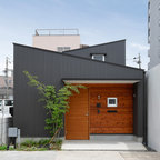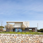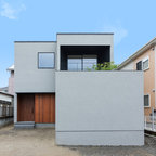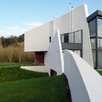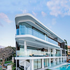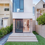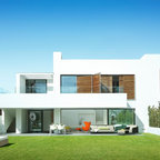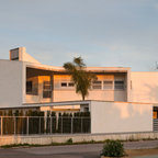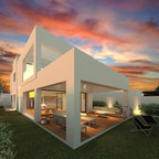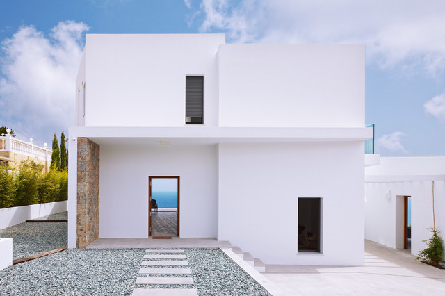 Diseño de fachada blanca, actual, de tamaño medio, de dos plantas, con tejado plano y revestimiento de estuco — Houzz