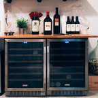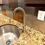 Good flow for entertainment area, brings in wood and brick. Has character.