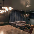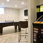 Modelo de sótano con ventanas urbano, sin chimenea, con paredes marrones, suelo de madera en tonos medios y suelo marrón — Houzz