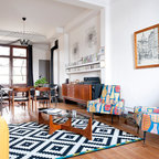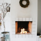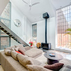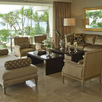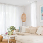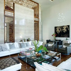 Modelo de salón tropical con paredes blancas, televisor colgado en la pared y suelo blanco — Houzz