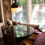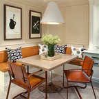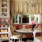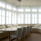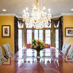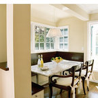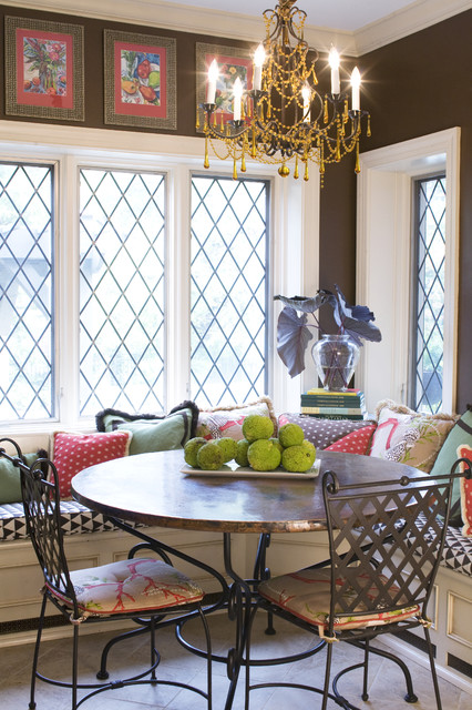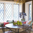 A bistro-style table for two brings Old World style to this breakfast nook. A built-in banquette provides plenty of extra seating for family and friends. Tudor-style windows fill the space with light, and a chandelier adds extra sparkle and style.