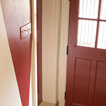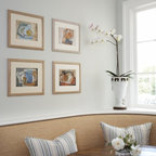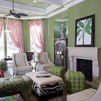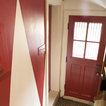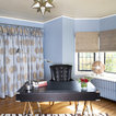 A little busy but pretty. Love the diamond shape repeat, contrast of white window frames with dark wall paint, and row of pictures at the top.