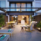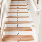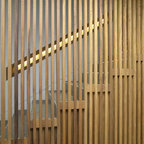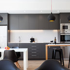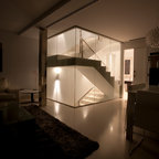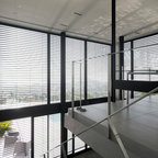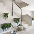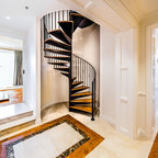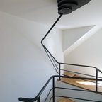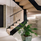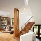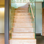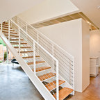 Diseño de escalera en U, actual, con escalones de madera, contrahuellas de madera y barandilla de metal — Houzz