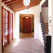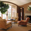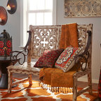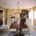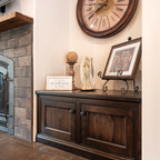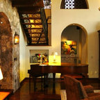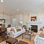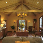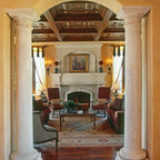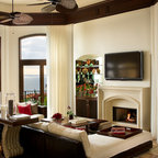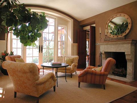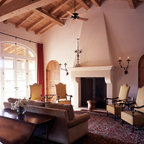 Imagen de salón cerrado, mediterráneo, grande, sin televisor, con paredes marrones, suelo de cemento, chimenea tradicional, marco de chimenea de hormigón y suelo marrón — Houzz