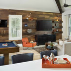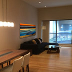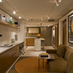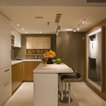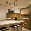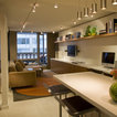 Love this...verticale table/island from kitchen counter...Great storage. Look at the lights!