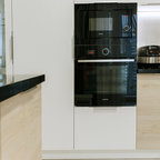 Diseño de cocina comedor en L, actual, de tamaño medio, sin isla, con fregadero encastrado, armarios con paneles lisos, puertas de armario verdes, salpicadero blanco, electrodomésticos de acero inoxidable, suelo de madera clara, suelo beige y encimeras blancas — Houzz